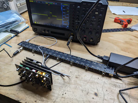 - Prototype pieces for our new EuroRack enclosure arrived, and we had some successful testing of our new DC Power & Sync distribution busboard. Unfortunately one of the case pieces arrived from the fabricator warped -- they've refunded us but that's why you can see some gaps and imperfections in the below photo. Everything else looks good though and we'll be ordering a small quantity of cases for production this month.